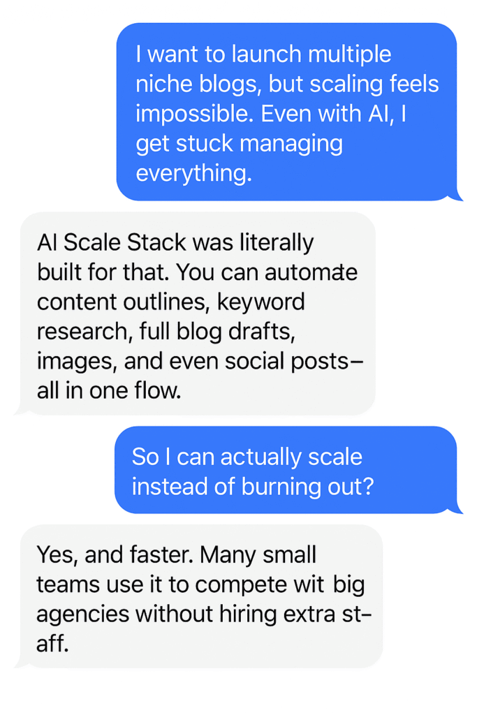 👉 I was constantly stressed about producing content across multiple blogs. AI Scale Stack allowed me to replace expensive tools and writers while cutting costs by 70–80%.